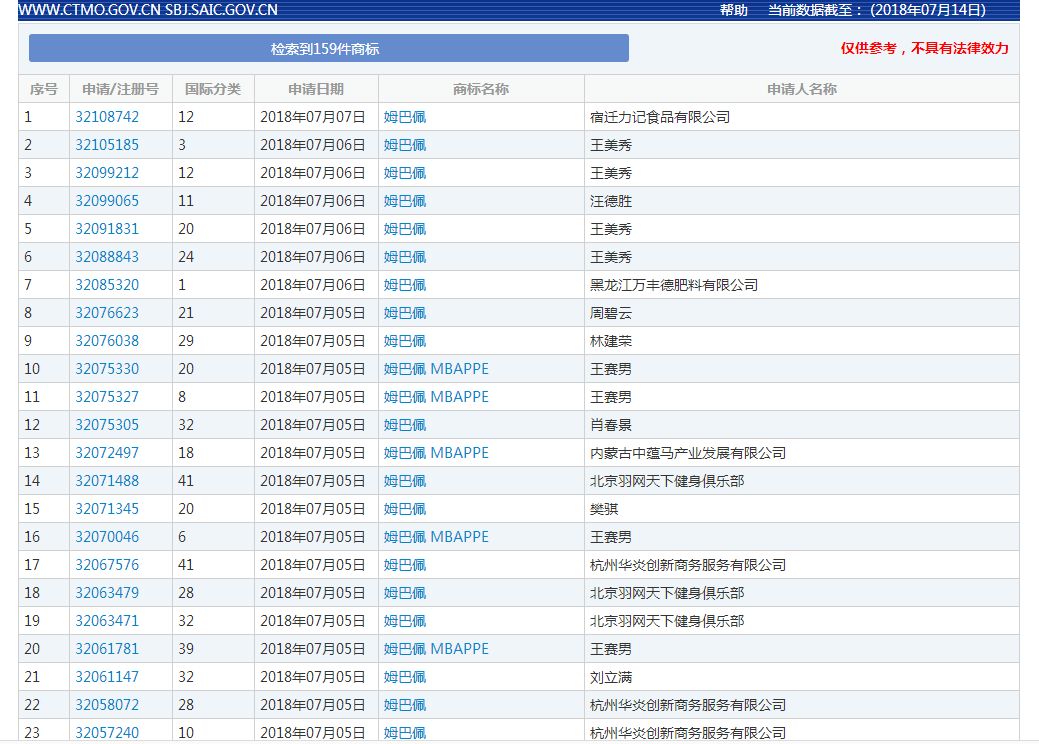 Mbapp火了,有心人迅速瞄準(zhǔn)商機(jī),紛紛申請(qǐng)注冊(cè)其商標(biāo)。比賽第二天,國(guó)家商標(biāo)局收到27份“Mbapp”或“Mbapp MBAPPE”商標(biāo)注冊(cè)申請(qǐng)。第三天,申請(qǐng)人數(shù)上升到58人。截至7月14日,已有159人申請(qǐng)注冊(cè)“Mbapp”或“Mbapp MBAPPE”商標(biāo),涉及各個(gè)行業(yè)。