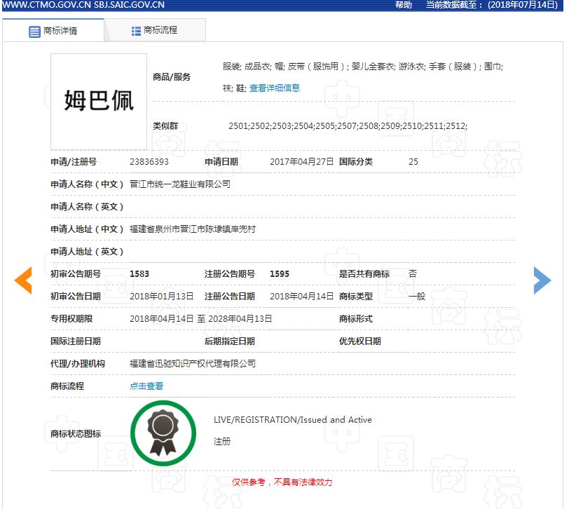從2017年到本屆世界杯開(kāi)始,商標(biāo)局只受理了17件這樣的申請(qǐng)。由于申請(qǐng)?zhí)峤粫r(shí)間為2017年,晉江同益隆鞋業(yè)有限公司已獲準(zhǔn)在服裝等商品上使用“Mbapp”商標(biāo);丹陽(yáng)瑞金眼鏡貿(mào)易有限公司也被批準(zhǔn)用于眼鏡和其他商品。除了上述兩家公司,最近提交的商標(biāo)申請(qǐng)大部分都在等待受理,暫時(shí)無(wú)法查詢?cè)敿?xì)函件。