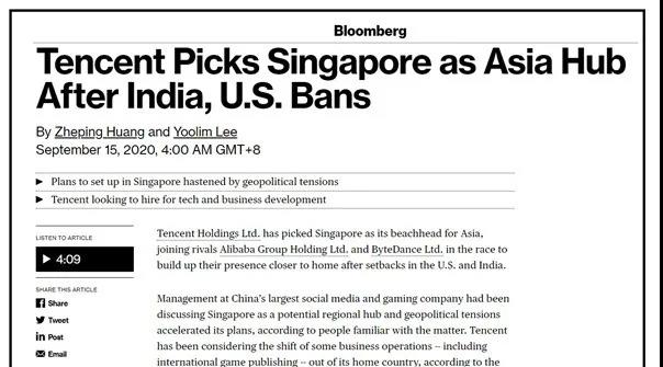 9月15日,繼阿里巴巴和字節(jié)跳動(dòng)之后,騰訊集團(tuán)也選擇在新加坡設(shè)立其在亞洲其他地區(qū)的橋頭堡。