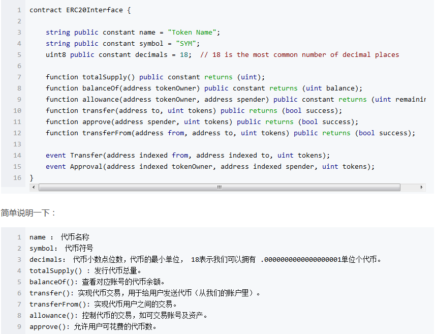 這里也介紹一下ERC20,這是以太坊定義的令牌標(biāo)準(zhǔn)。這個標(biāo)準(zhǔn)要求我們在實現(xiàn)代幣時必須遵守約定。只有支持協(xié)議,才能得到以太坊錢包的支持。下面是協(xié)議代碼界面??床欢矝]關(guān)系。程序員就能搞定。